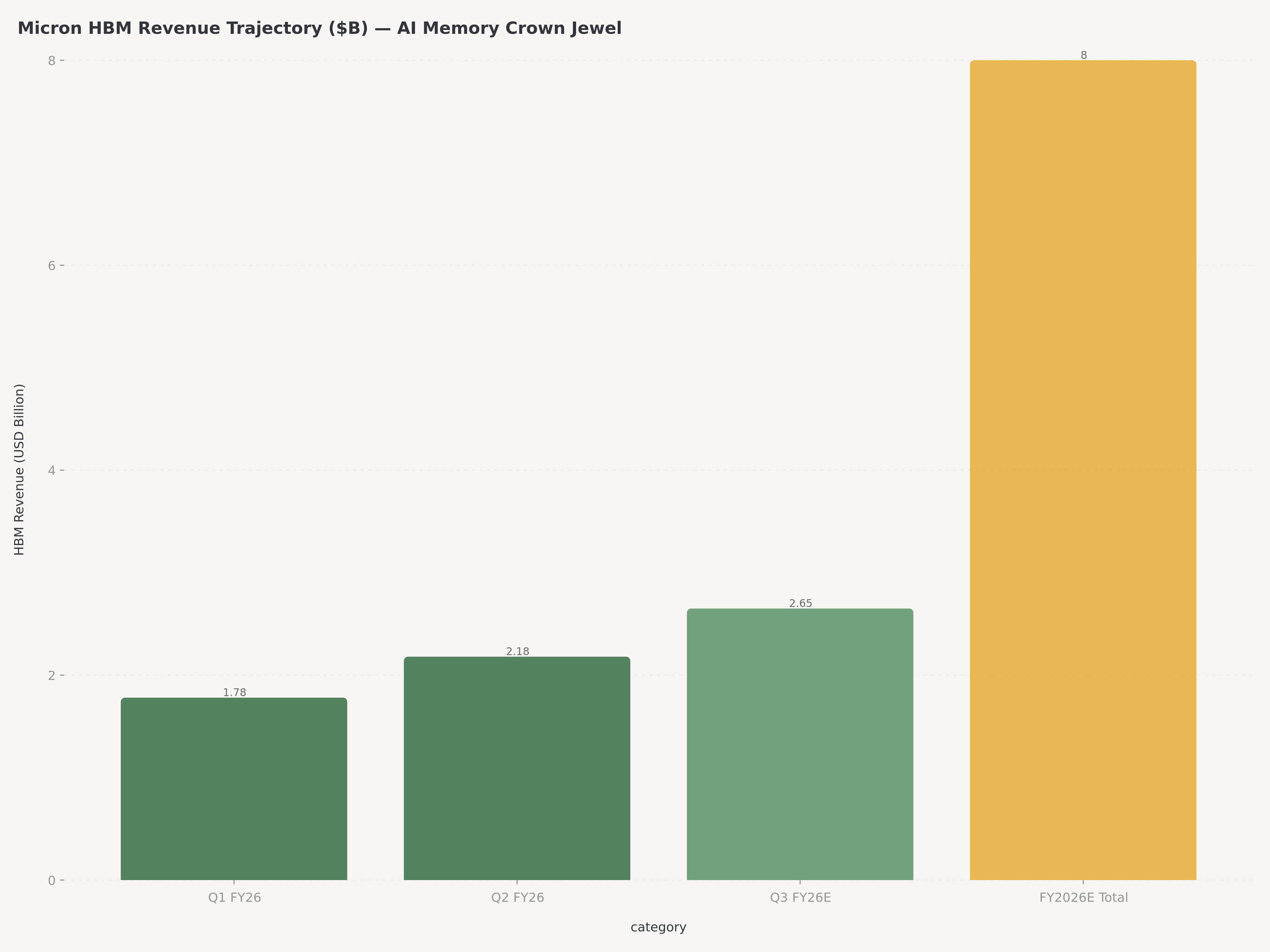 - マイクロンのHBMフランチャイズは王冠の宝石である:FY2026 Q2のHBM売上高は$2.18B(QoQ +22%)、HBM3E 36GBはすでに量産出荷中で、HBM4は6社のパートナーへサンプル出荷中 — これによりMUはSKハイニックス、サムスンと並び、CY2026のHBM TAMの約20%を獲得できる位置にある