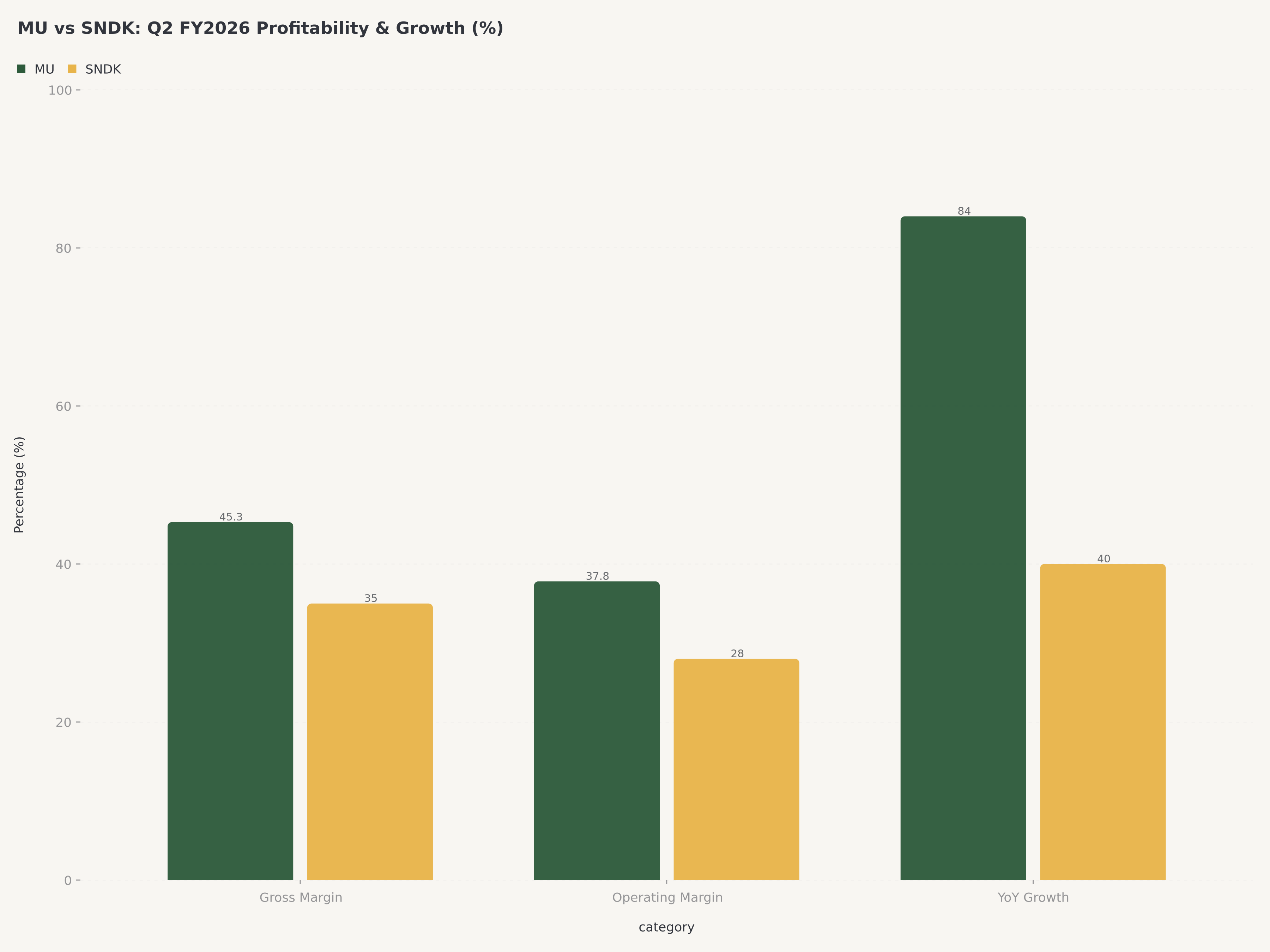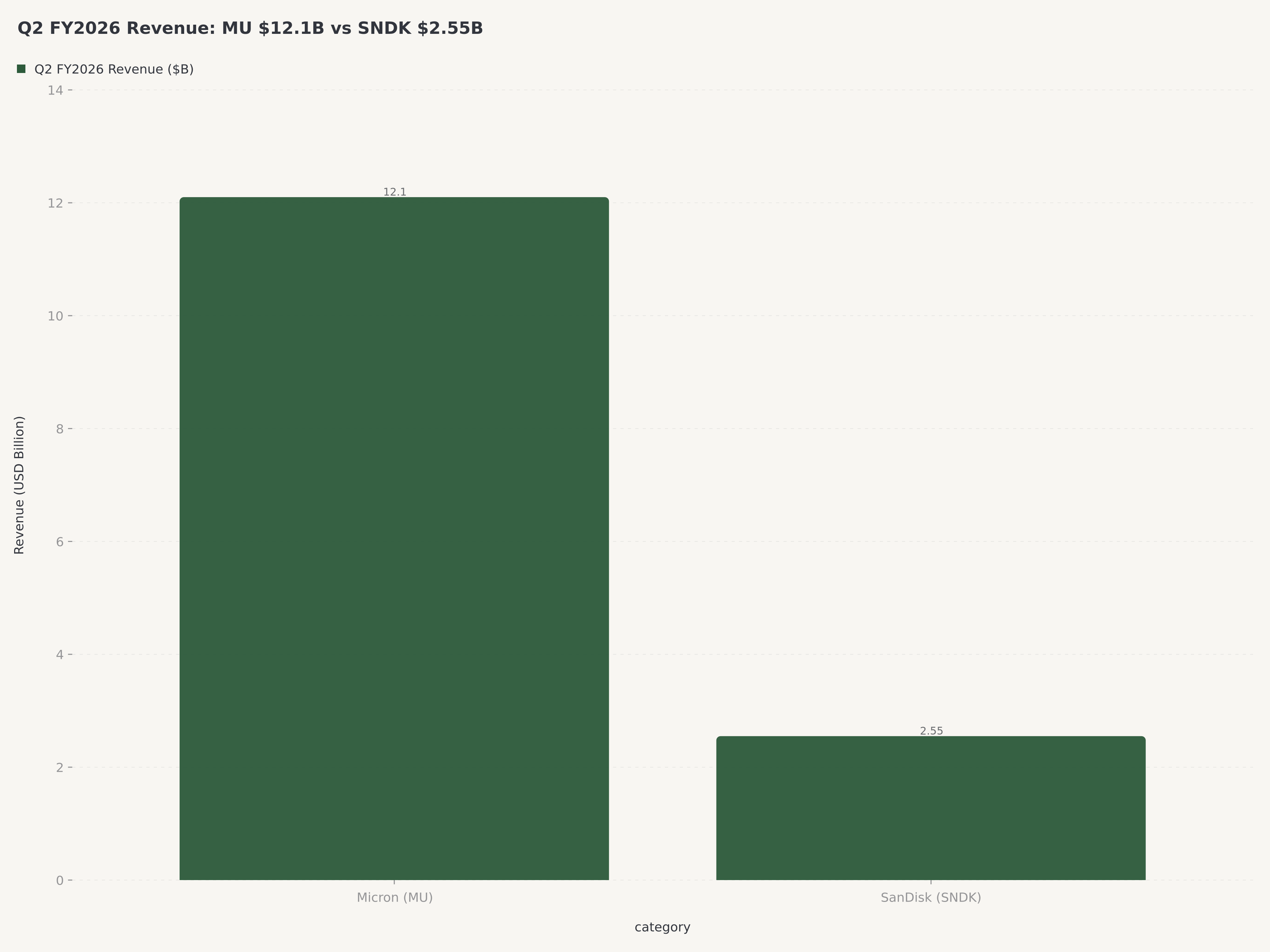規模の格差を体に叩き込むことが重要だ。マイクロンのFY2026 Q2売上高$12.1Bはサンディスクの$2.55Bの約4.7倍。年率換算ベースで、マイクロンは~$50Bの売上規模、サンディスクは~$10Bの売上規模である。マイクロンの粗利益率は実質的に高い(GAAP 45% 対 Non-GAAP 35% — 会計手法を揃えるとおおよそ匹敵する)。しかしサンディスクの連続成長モメンタムはより大きく、絶対値でもガイダンス・トラジェクトリでも優っている。