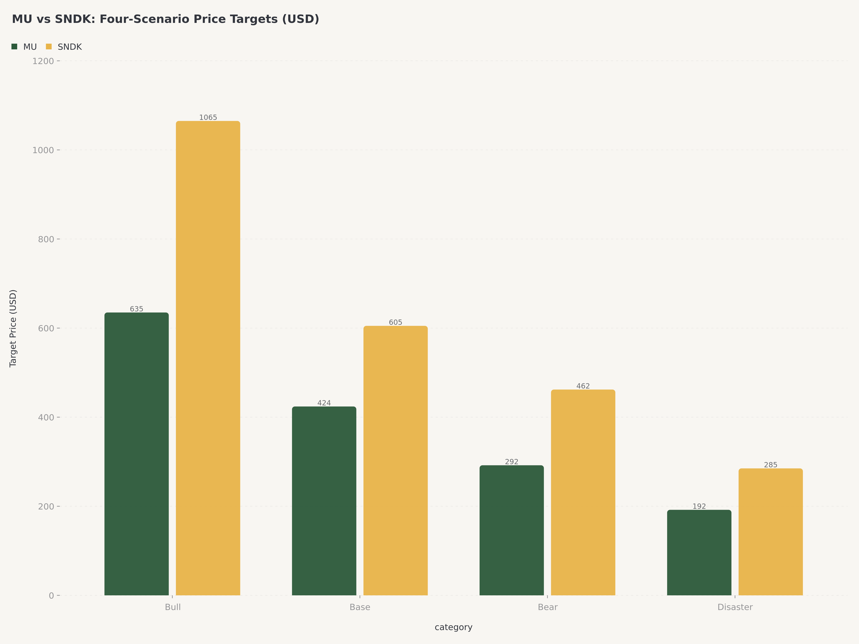 マイクロン(MU)が現行株価でよりよいリスク調整後リターンを提供する。$465.66ではマイクロンは確率加重公正価値$423を約10%上回る水準にあり、Bullケース$635(35%確率)への意味のある上値を持つ。サンディスクは$944.51で確率加重公正価値$698を約35%上回って取引され、Bullケース$1,065(40%確率)への上値は限定的である一方、Bearケース$462へのダウンサイド(Bear+Disaster合計45%確率)は大きい。当社はMUをBuy(目標株価$550)、SNDKをHold(目標株価$750)と評価する。