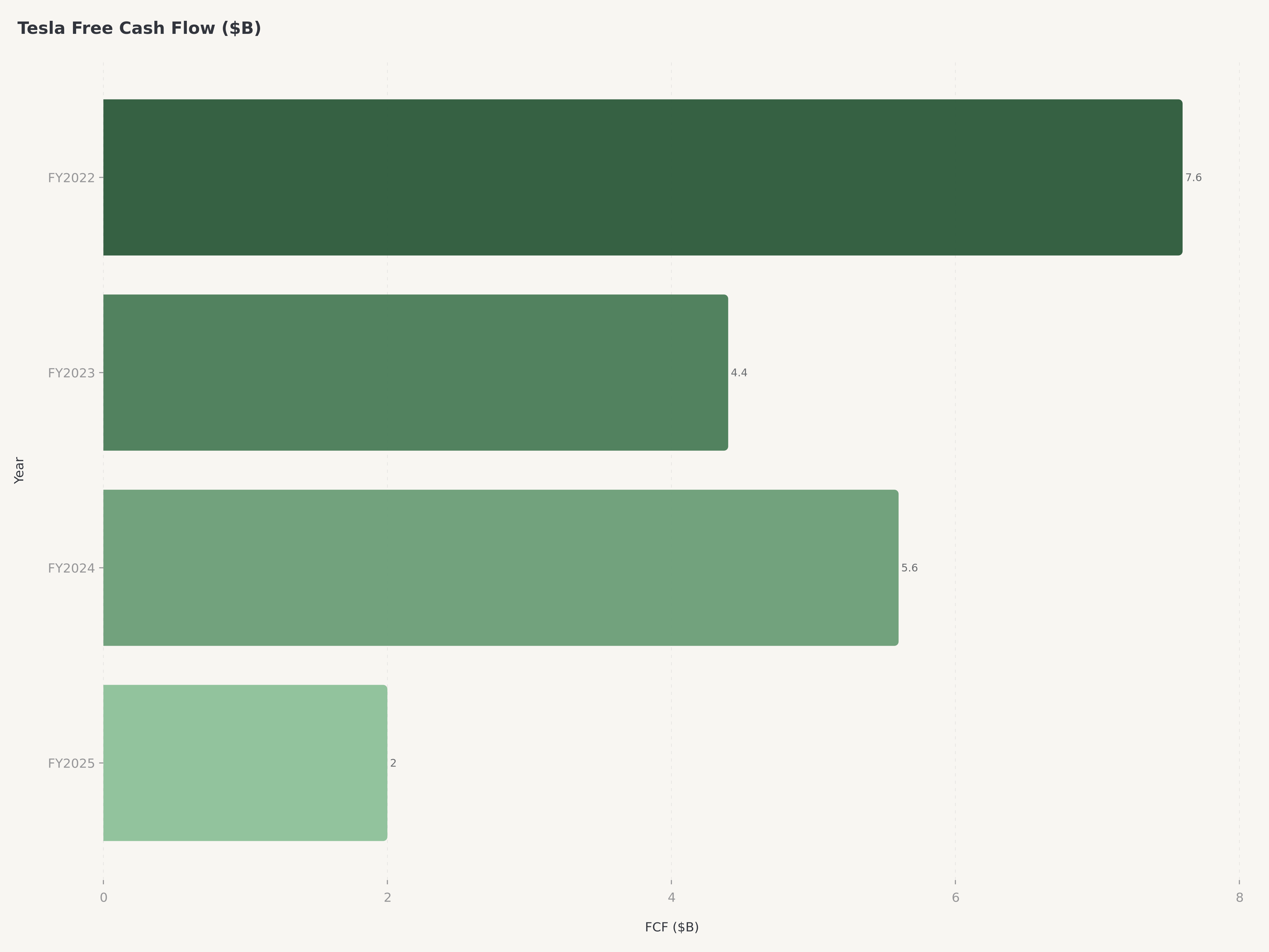 フリーキャッシュフロー(FCF)創出は大幅に悪化し、FY2025は約20億ドルと前年の56億ドルから減少した。圧縮はマージン低下に伴う営業キャッシュフローの減少と、新生産能力、ロボタクシープラットフォーム、Optimus開発への設備投資増加の両方を反映している。経営陣はFY2026の設備投資を200億ドル超とガイダンスしており、この数字が実現すれば、売上の大幅な回復がない限り、FCFはほぼ確実にマイナスに転じる。
