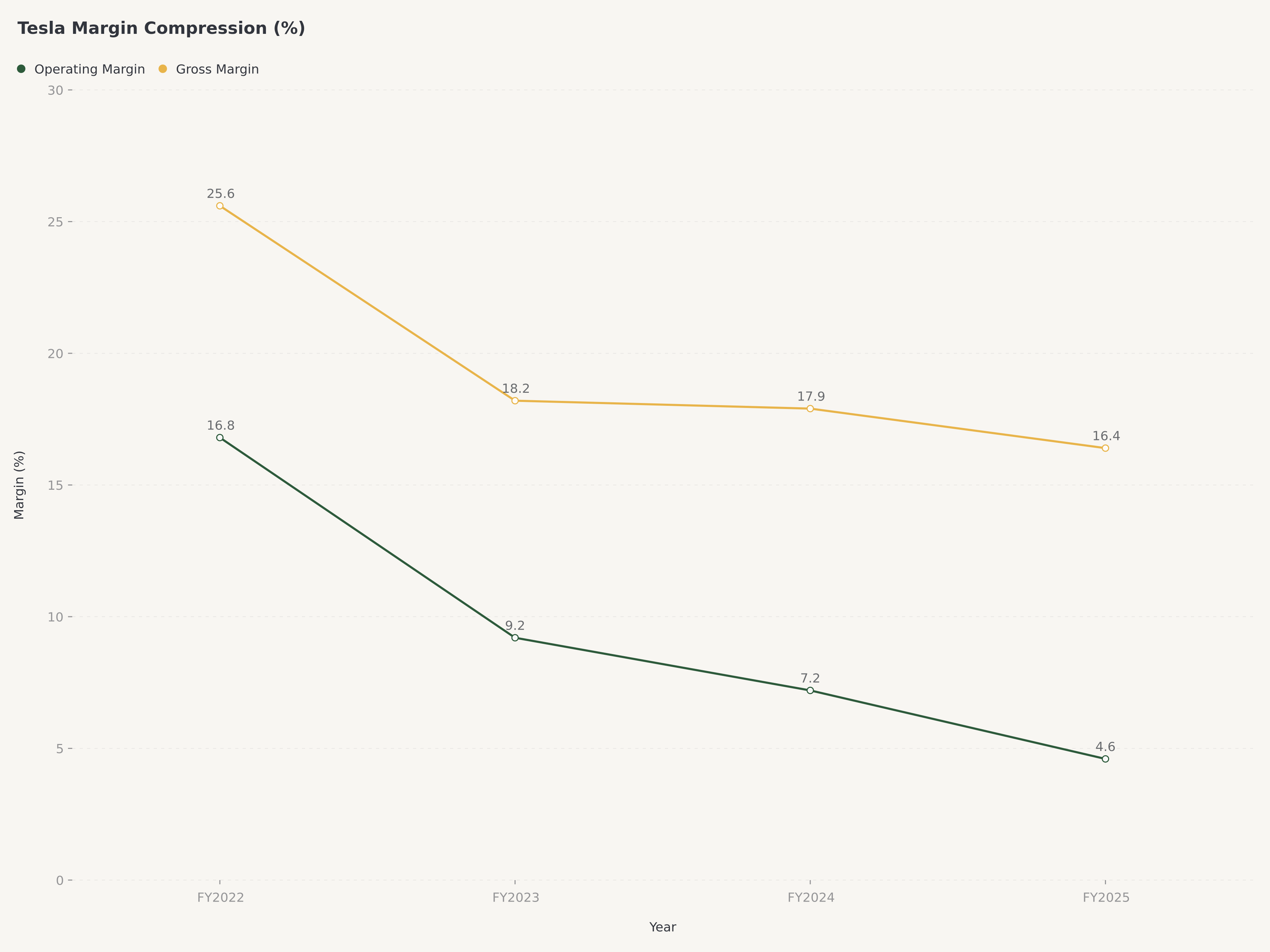 - GAAP営業利益率はFY2024の7.2%から4.6%に縮小し、自動車部門粗利益率は約16.4%に低下した。これは積極的な値下げ、投入コストの上昇、刷新されたModel Yの生産立ち上げ待ちのラインナップを反映しており、今後2四半期で反転する可能性は低い。