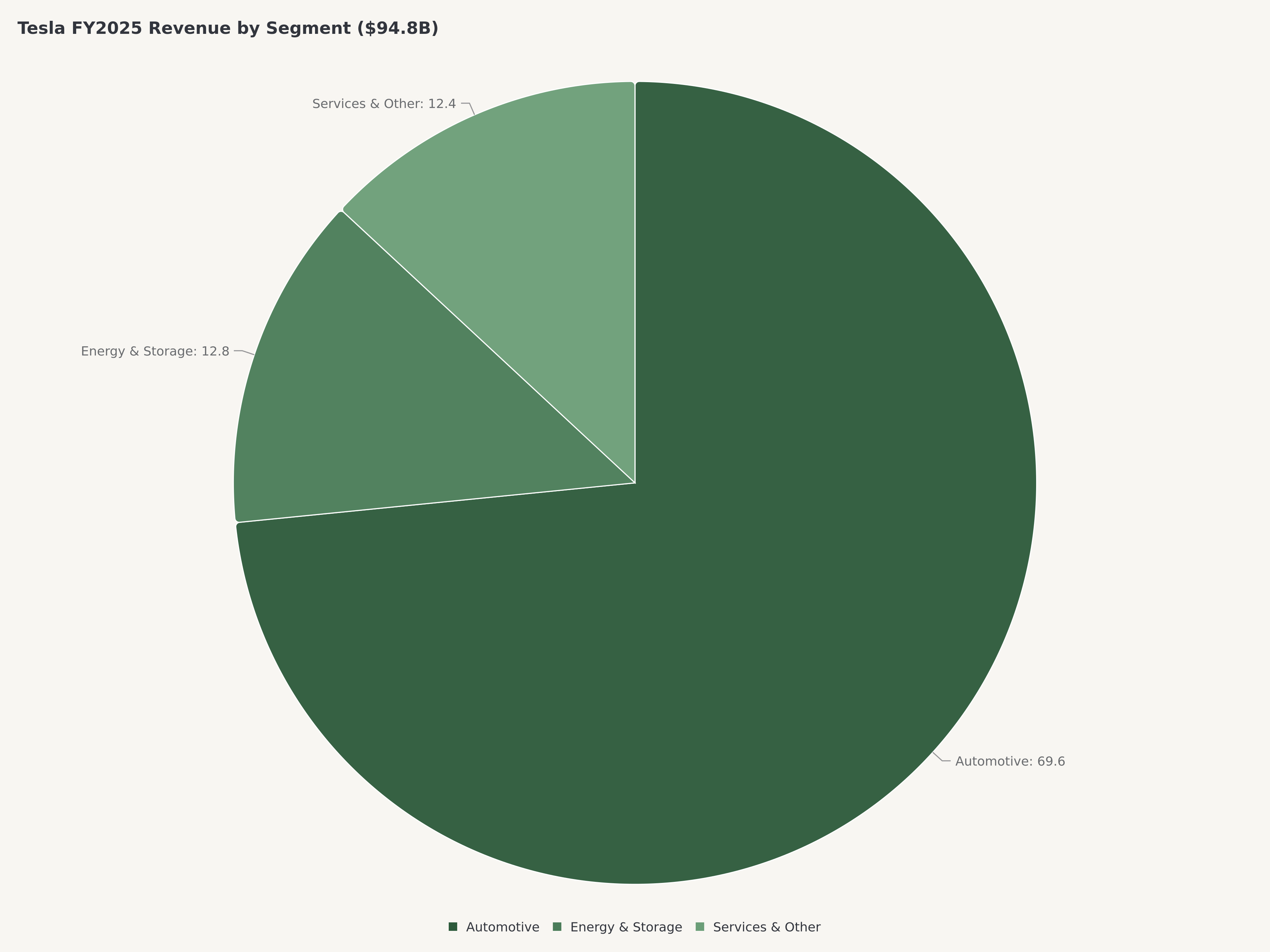 2026年1月に発表されたテスラのFY2025業績は、投資家が年間を通じて追跡してきたマージン圧縮を確認した。総売上948億ドルはFY2024の977億ドルから2.93%減少した——テスラの上場企業としての初めての年間売上減少である。減少は完全に自動車部門によって牽引され、グローバルな値下げに伴う平均販売価格の低下と、低価格帯のModel 3およびModel Y派生モデルへの納入ミックスシフトが原因である。FY2025の納入台数164万台はFY2024の181万台から9%減少し、競争圧力と刷新されたModel Y生産立ち上げ前の移行期間の両方を反映している。