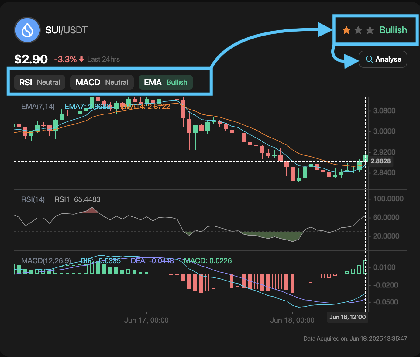 Technical Signalsあなたが取引するあらゆる暗号資産トークンに対して、即時の技術的分析を提供します。Edgen Searchとシームレスに統合されているこの強力なツールは、RSI(相対力指数)、MACD(移動平均収束/発散)、移動平均線、およびサポート/レジスタンスレベルなどの重要な指標を瞬時に提供します。技術的シグナルテクニカル分析を単純かつ実用的にし、市場の機会を迅速に評価し、より自信を持って取引するのに役立ちます。