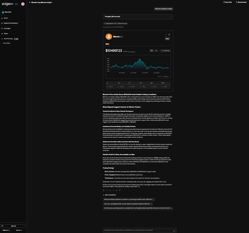 - 可執行步驟與策略: Edgen Search建議您接下來該做什麼,包括進場或出場點位,或投資組合配置。