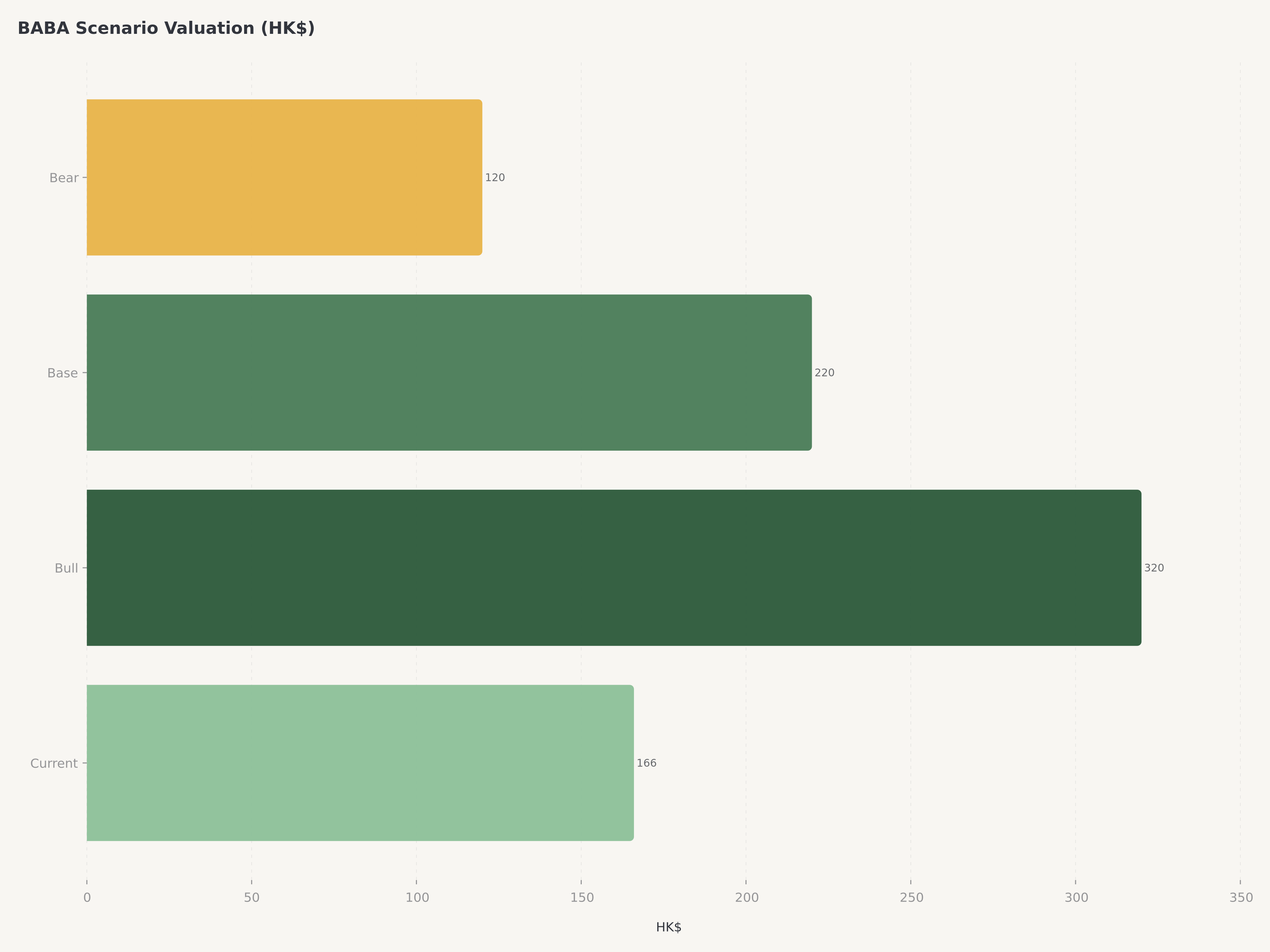 - 以约21.4倍远期市盈率,加上每股$52年度股息和$91亿回购的股东回报计划,阿里巴巴在中国科技领域提供了罕见的结构性增长、资本回报和深度价值的组合——我们给予买入评级,目标价HK$220,代表约32%的上涨空间。