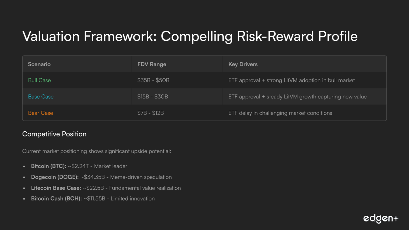 Litecoin occupies a unique and powerful position in the market. While it is benchmarked against other Proof-of-Work coins, its strategic expansion into Layer-2 functionality allows it to compete on a new vector. The Base Case valuation reflects its potential to maintain its top-tier PoW status while capturing new value from its emerging smart contract ecosystem.
