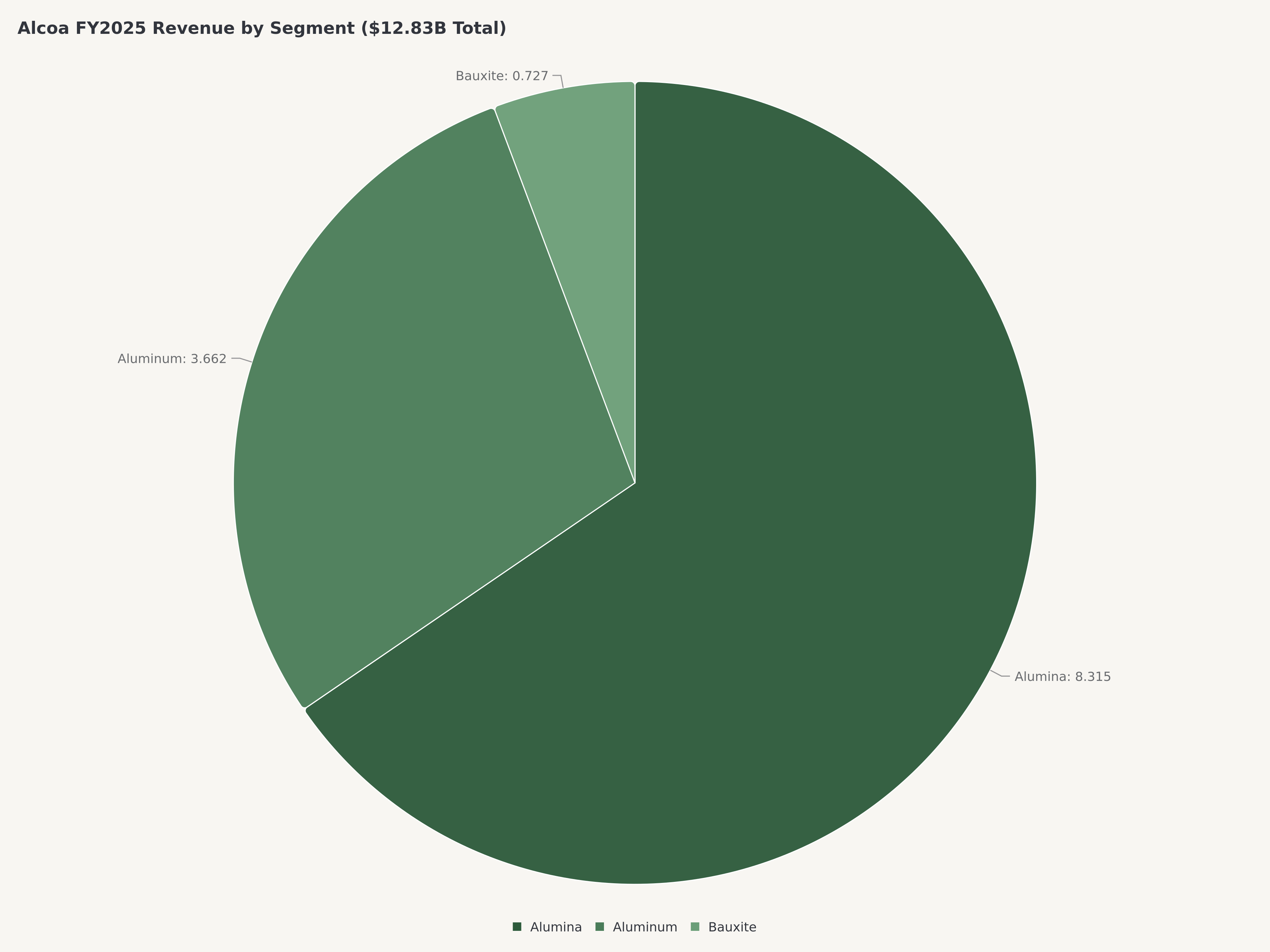 La performance financière d'Alcoa pour l'exercice 2025 a démontré le levier bénéficiaire inhérent à un producteur de matières premières verticalement intégré opérant dans un environnement de prix favorable. Le chiffre d'affaires total des trois segments opérationnels a atteint $12.83B. Le segment Alumine a été le plus performant, générant $8.315B de revenus — un résultat annuel record porté par des prix d'alumine restés élevés tout au long de l'année en raison de la tension mondiale de l'offre. Le segment Aluminium a contribué $3.662B, tandis que le segment fondamental Bauxite a ajouté $727M.