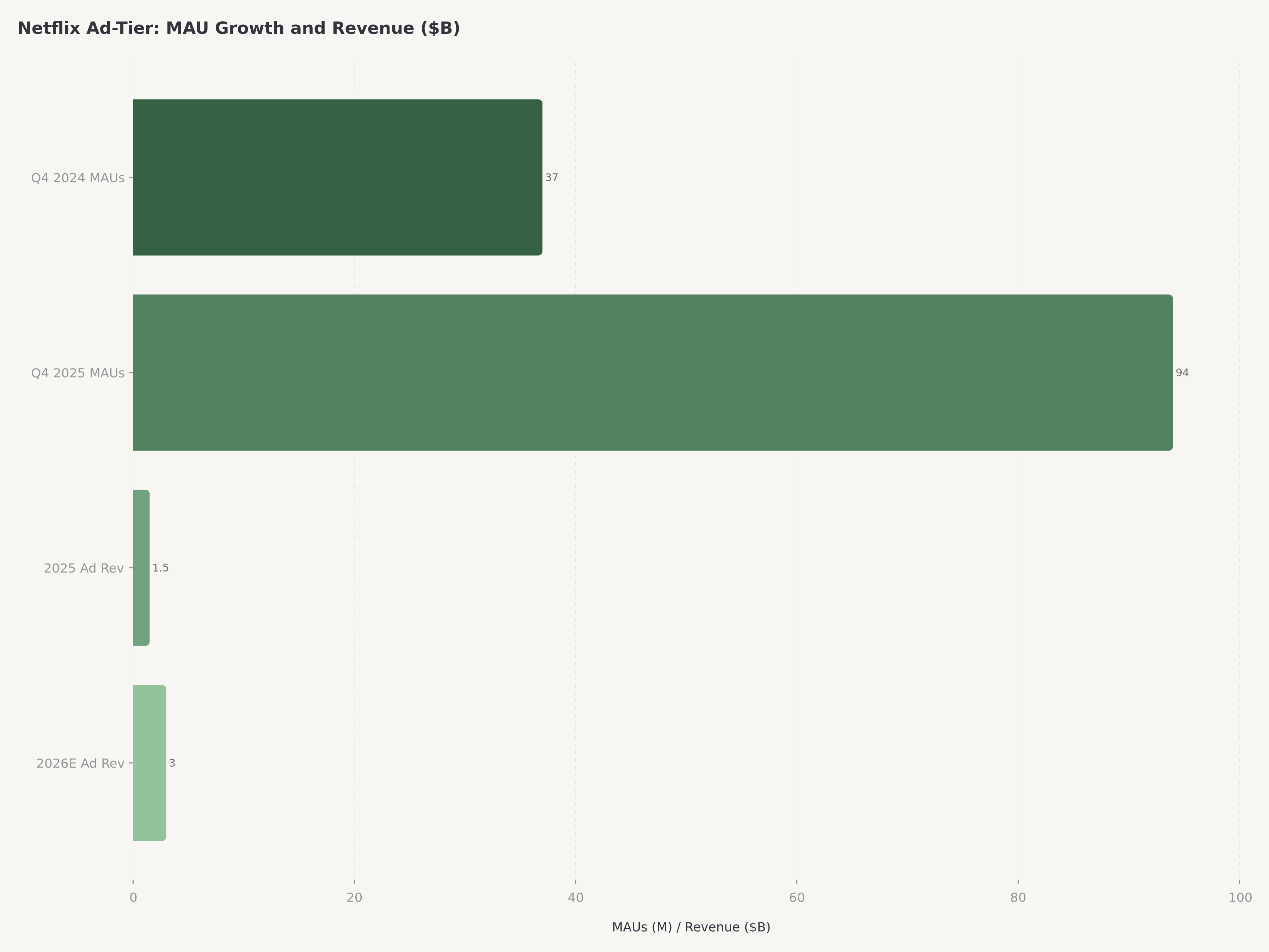 - L'offre publicitaire a atteint 94 millions d'utilisateurs actifs mensuels fin T4 2025, soit une multiplication par 2,5 en un an, avec des revenus publicitaires en passe de doubler a environ 3 Mds $ en 2026 — transformant Netflix d'un modele d'abonnement pur en un moteur de monetisation hybride avec un revenu par utilisateur structurellement plus eleve.