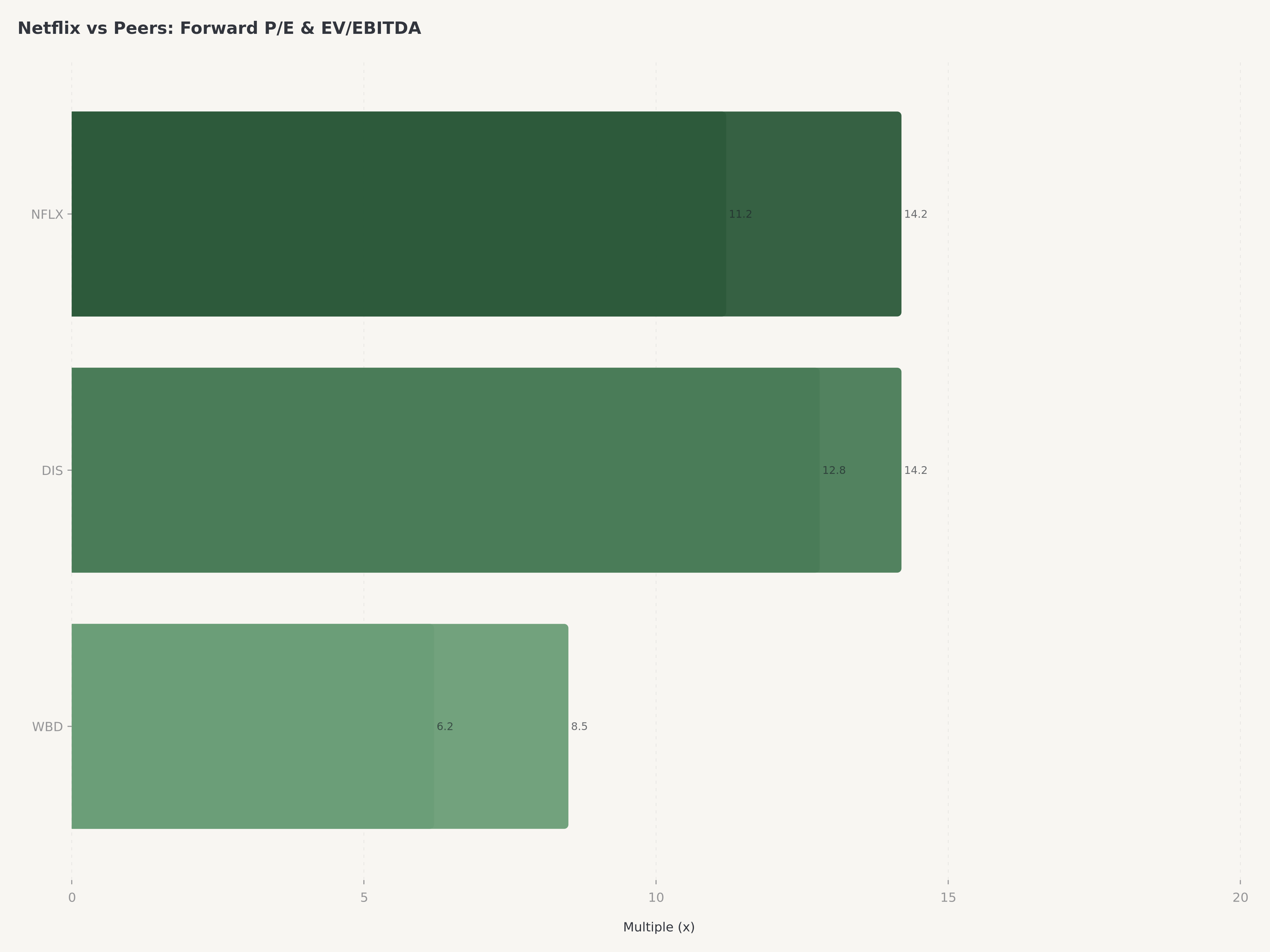 Netflix se negocie a un PER previsionnel d'environ 14,2x, a peu pres en ligne avec le PER previsionnel de Disney a 14,2x. Sur une base VE/EBITDA, Netflix se negocie a 11,2x, sous la mediane du secteur technologique. La difference cruciale est que Netflix genere une marge FCF de plus de 20 % avec 9,46 Mds $ de FCF pour FY2025, tandis que les operations streaming de Disney n'ont atteint la rentabilite que recemment. Warner Bros. Discovery n'a pas ete constamment rentable en streaming. Sur une base PEG, le ratio de Netflix pres de 1,0x est attractif compte tenu de sa croissance de CA de 16 % et de ses marges en expansion, ce qui en fait l'une des grandes capitalisations de croissance les plus raisonnablement valorisees dans le secteur Services de communication.