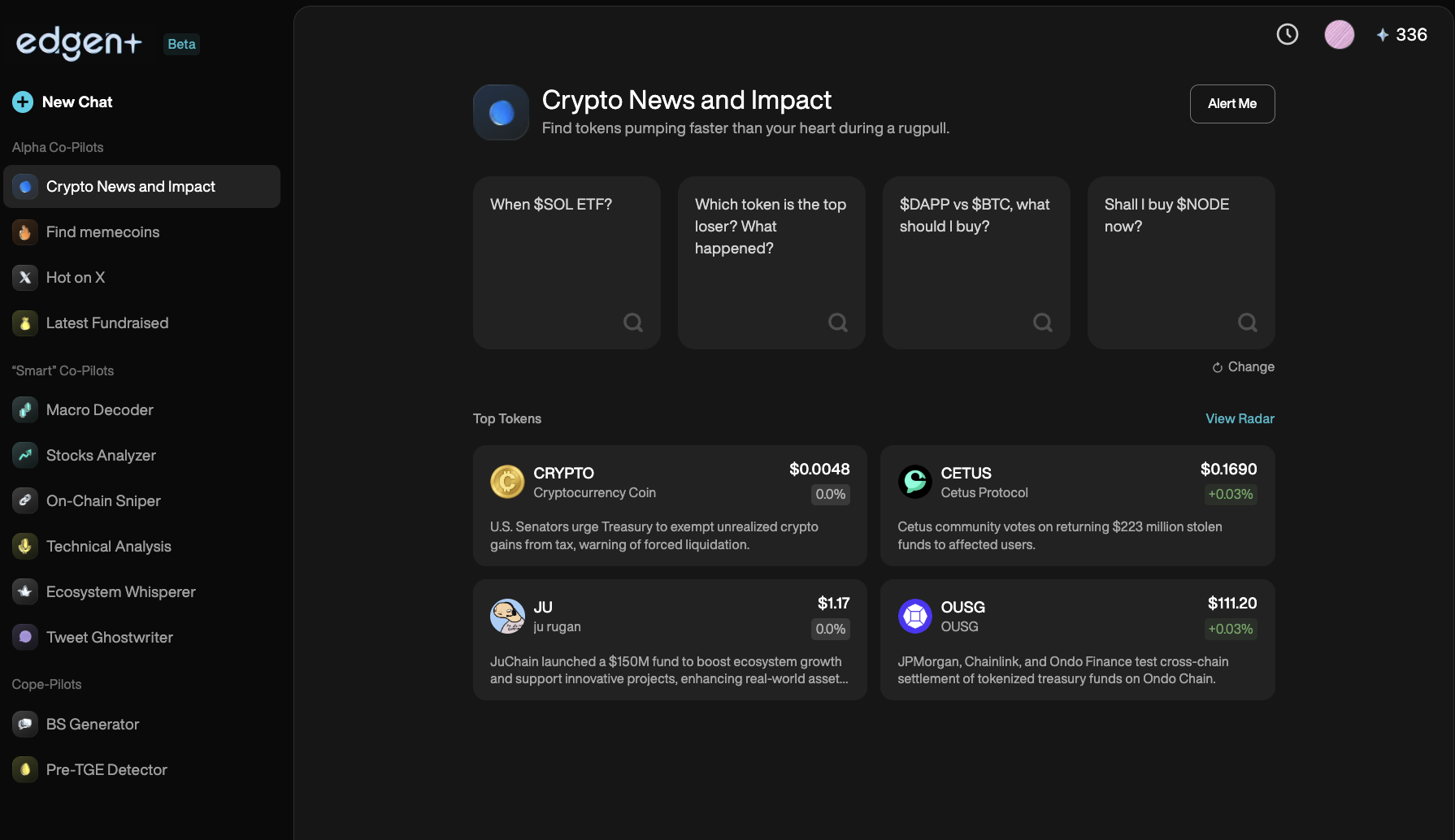 - Edgen Radar: 実時間での市場の感情、価格の変動、およびアルファ信号を表示します。