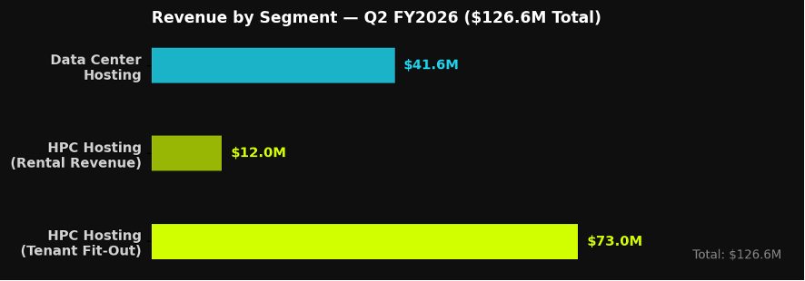 2026财年第二季度(截至2025年11月30日)是一个决定性时刻:总营收飙升至1.266亿美元,同比增长250%,较市场普遍预期的8670万美元高出46%。HPC托管贡献了8500万美元,数据中心托管贡献了4160万美元(同比增长15%)。